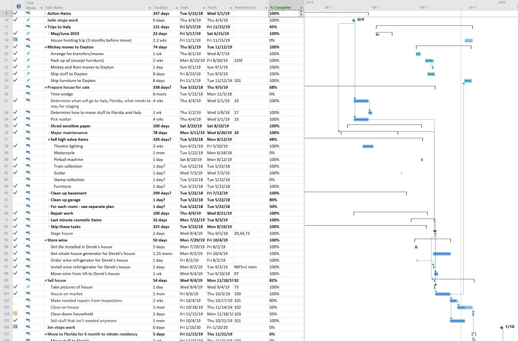 I know that our plan is a bit complicated and confusing, so I want to use this post to give a status update. I thought about using my Microsoft Project plan, but decided against it… Here’s a small piece of it: