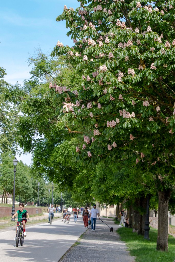 Horse chestnut trees are clustered in several locations around Lucca’s wall. This picture was taken on Festa della Mamà (Mother’s Day) with many families enjoying their time on the wall.