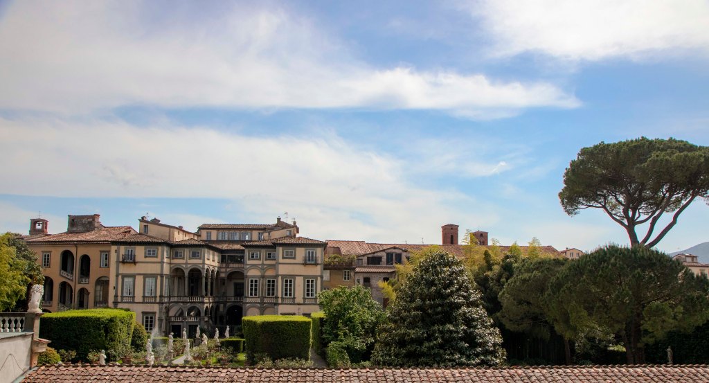 Palazzo Pfanner “is a palace and a garden in Lucca, Italy, now converted into a museum of art and artifacts. The building dates to 1667, and is notable mainly for its fine garden.” This wide view is from Lucca’s wall and I especially like the large tree on the right side; I think that it is a Stone Pine tree. The benches on the wall near Palazzo Pfanner are highly sought after!