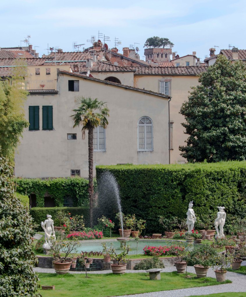 And here is a closeup of Palazzo Pfanner’s fountain surrounded by statues, lemon trees in big pots, and lots of other flowers. You can also see the Guinigi Tower with its oak trees planted on top of the tower!