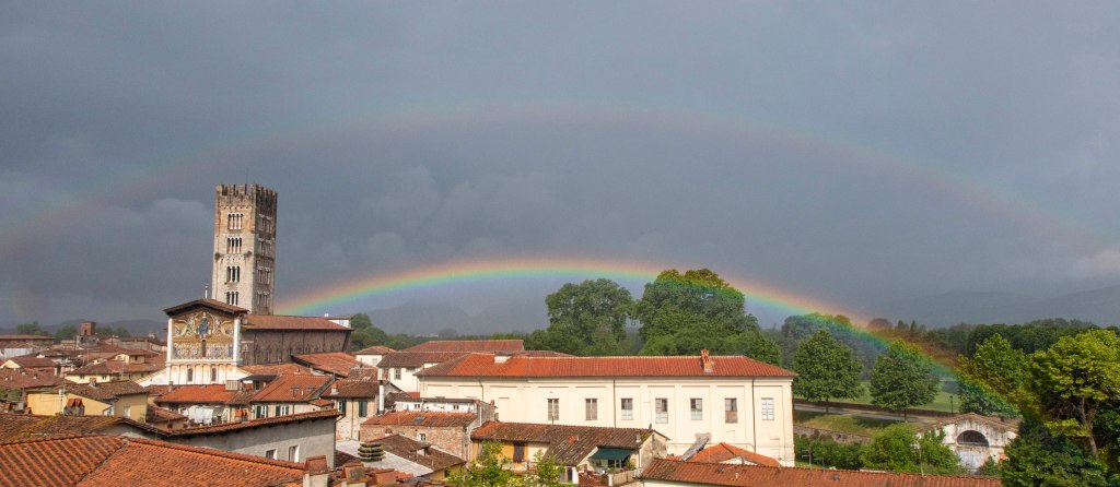 Friday morning, May 15th, Jim was in the altana and he called for me to come upstairs quickly. I panicked and rushed upstairs, ready for any kind of emergency, and he pointed to this beautiful double rainbow. The lower one ended on the Lucca wall. How beautiful is that!