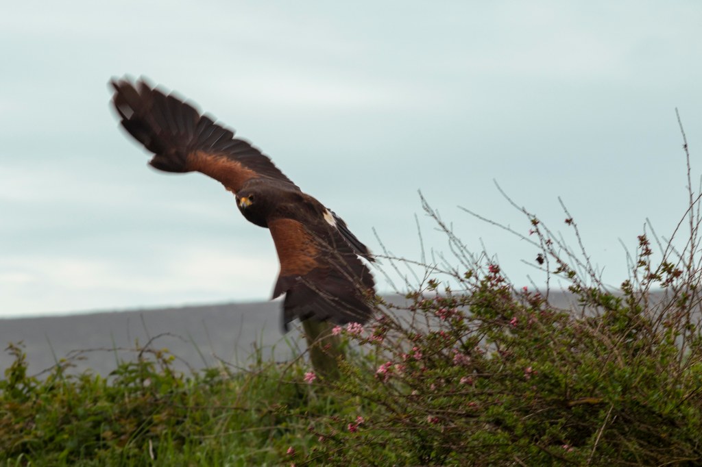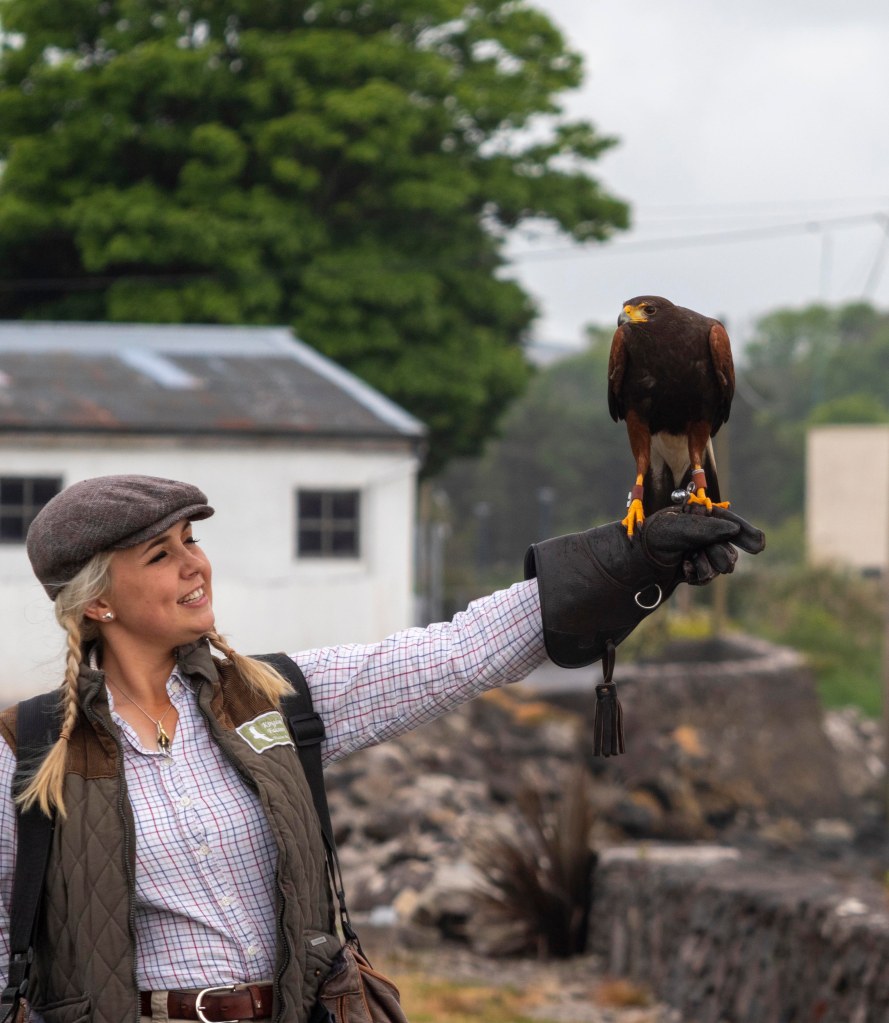 One of the touristy things to do in Ireland is to participate in a falcon or hawk walk. We choose a Private Hawk Walk with Kingdom Falconry in Dingle, Ireland. We spent an hour with Emily, a very experienced birder and falconer, talking all things birds. We spent most of the time with one Harris Hawk then had a walk through their aviary to see their other birds of prey. Click on this link to see a video of “our” hawk flying to me.